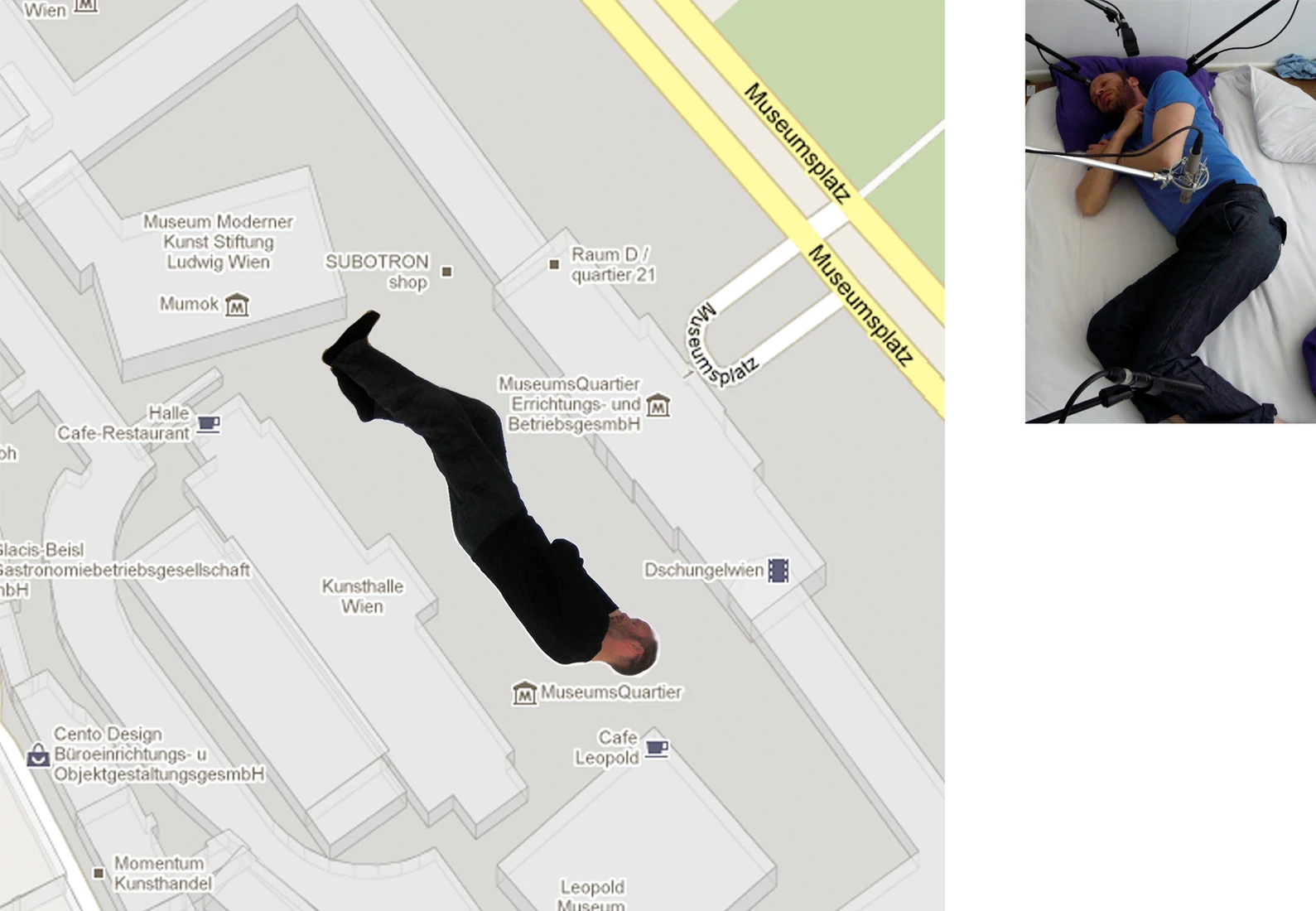 The resulting sound is being played through a large-scale speaker installation ”KLANGHIMMEL“ in Vienna’s MuseumsQuartier at night. The sonic presence of an amplified and enlarged sleeping body is created, lying quietly on the square.